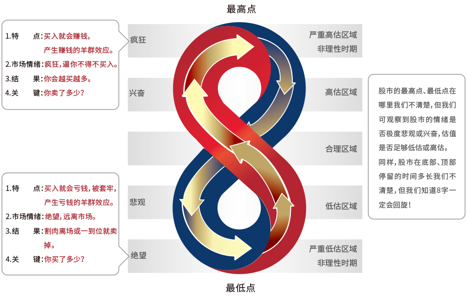 和盛丰悦的“8”字投资时机模型,蕴含了证券市场中牛熊周期的估值、情绪变化、买卖时机和仓位配置,揭露不同时期对应的投资策略。